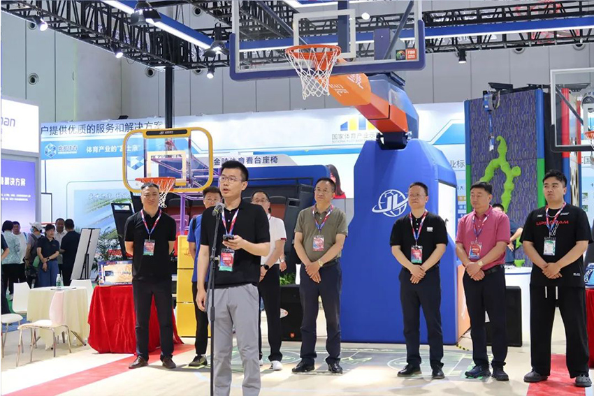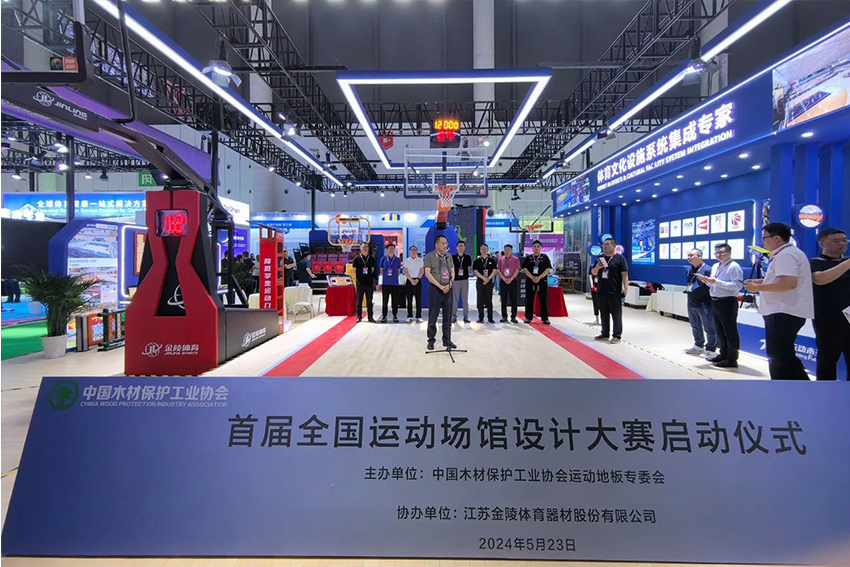 展會期間由中國木材保護(hù)工業(yè)協(xié)會運(yùn)動地板專委會主辦的首屆全國運(yùn)動場館設(shè)計大賽啟動儀式在金陵體育展位舉行,金陵體育總經(jīng)理李劍剛出席并致詞。