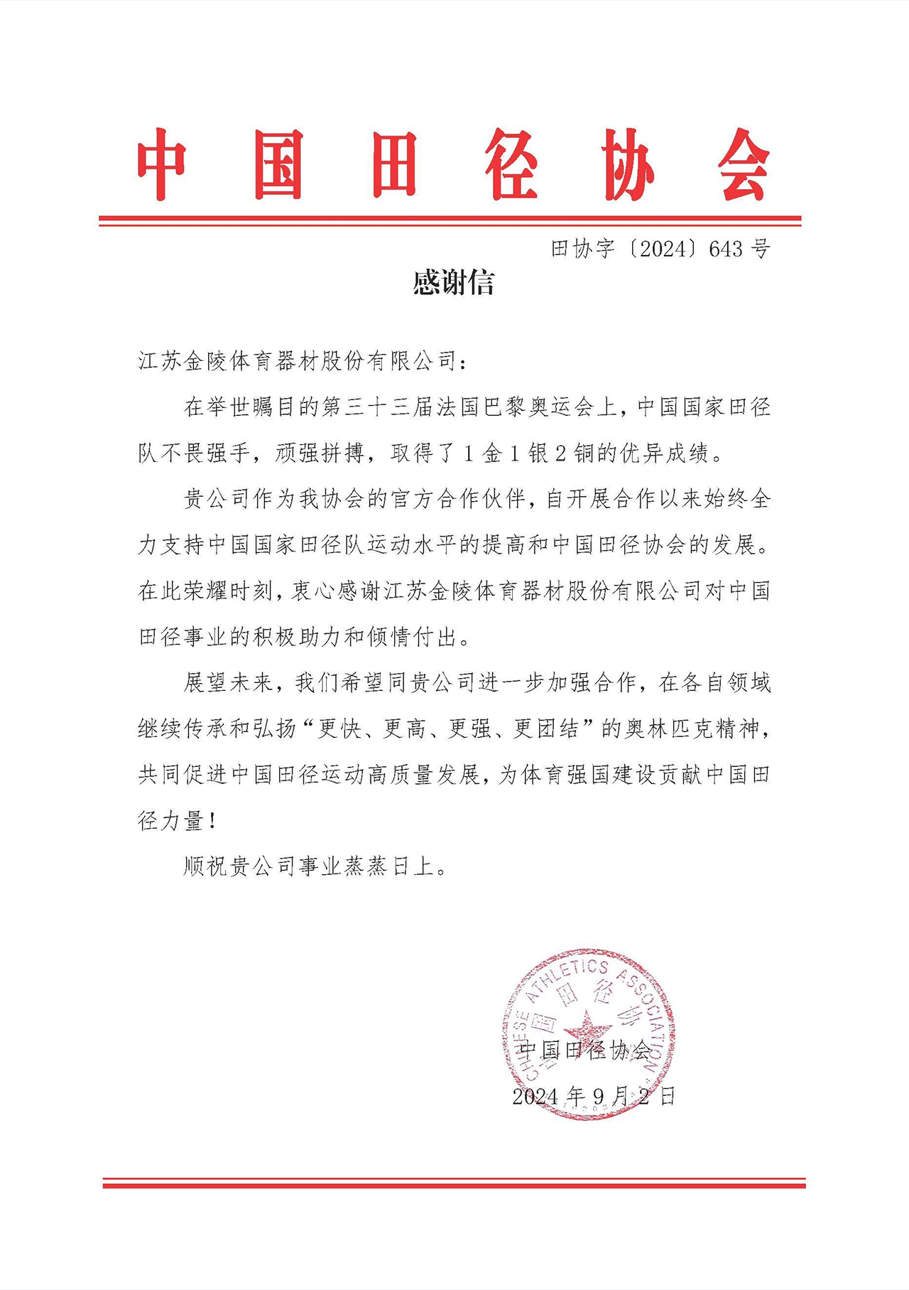 近日,中國田徑協(xié)會向金陵體育發(fā)來感謝信,感謝金陵體育為中國國家田徑隊奧運爭光做出的貢獻。